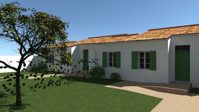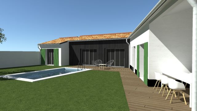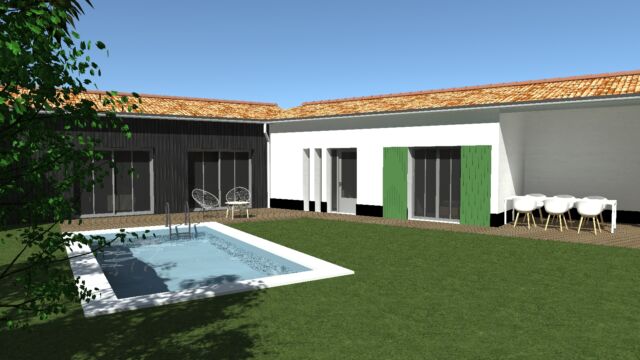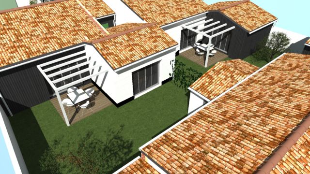 DESCRIPTION DU PROJET 3 MAISONS NEUVES AU BOIS-PLAGE : Sur une parcelle ayant deux accès sur rue, le terrain est divisé en 3 lots. Deux maisons s’implantent sur les parcelles Nord et une maison plus conséquente s’implante sur la parcelle Sud en drapeau. Les maisons comportent toutes des patios, élément phare de l’île de Ré apportant un complément d’ensoleillement notamment le matin dans les pièces de vies. Les séjours ont une double orientation, et les suites parentales sont toujours orientées sur le jardin notamment sur la piscine pour le lot 3. Un travail de façade a été mené avec l’ajout de bardage et de bande noire en pied de mur pour animer les façades y compris dans les patios.