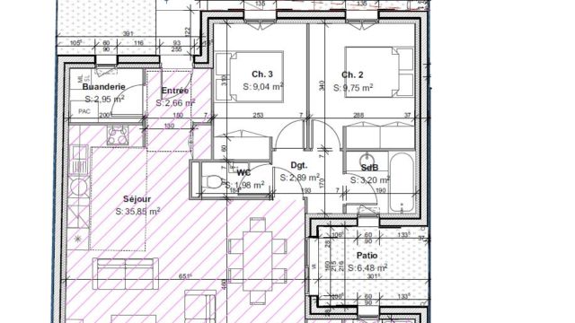 Lot 2 : Entrée, buanderie, pièce de vie, suite parentale, deux chambres enfants.