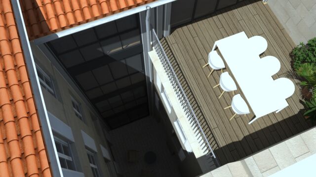 Un second volume en fond de cour, en R+2 sur cave, couvert d’une terrasse.