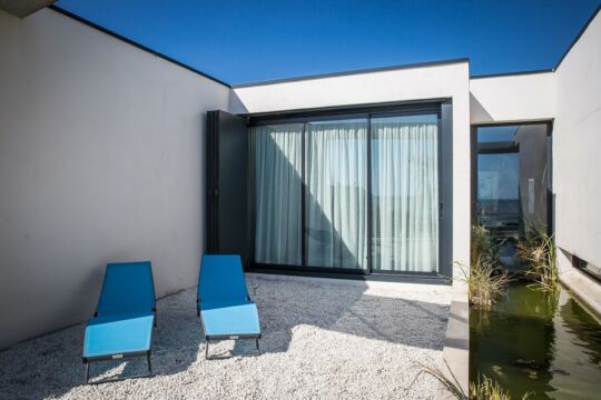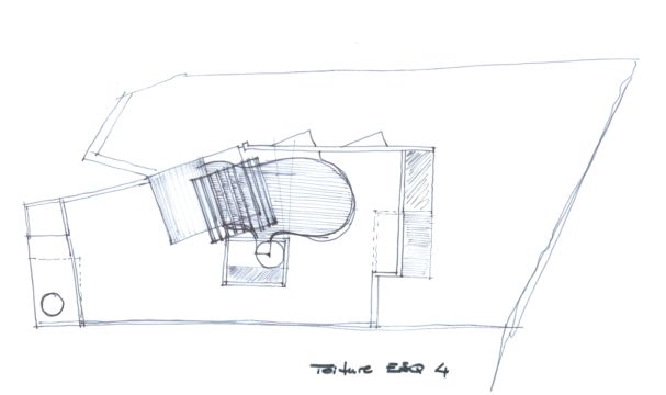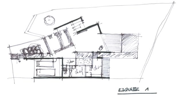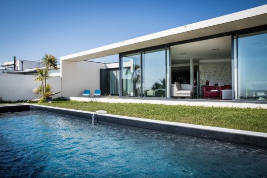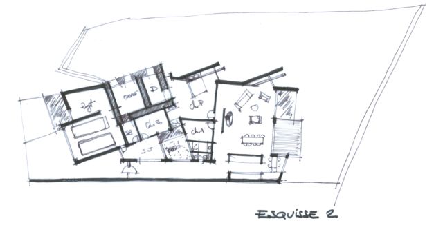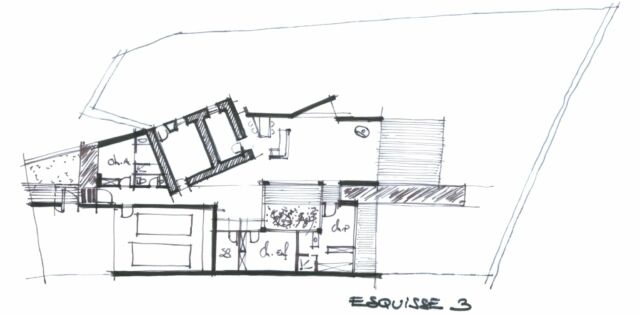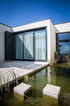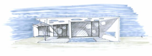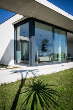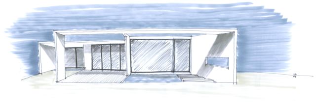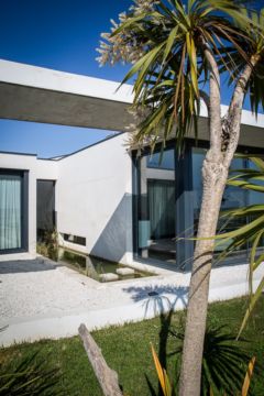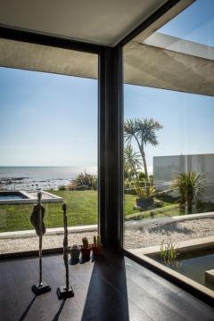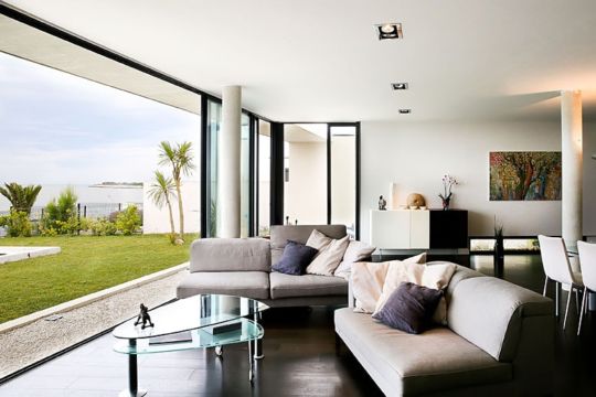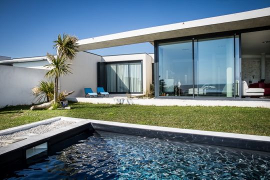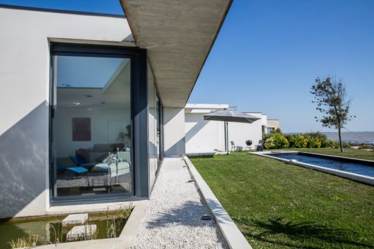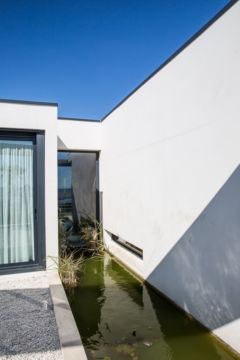Le projet se développe en longueur et fait référence aux villas de bords de mer, avec ses grands débords de toit permettant de se protéger du soleil et des surchauffes. Il est conçu comme une promenade qui commence par la rue, d’où l’on ne voit pas le panorama : La mer se dévoile au fur et à mesure de la progression du visiteur dans la maison pour se révéler enfin par l’accès au solarium, espace généreux dédié au soleil et au paysage.