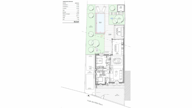 PROGRAMME : Entrée, 2 chambres avec salle de bain, WC, séjour, salle à manger et cuisine. Un abri de jardin, un préau et une piscine.
