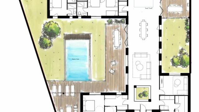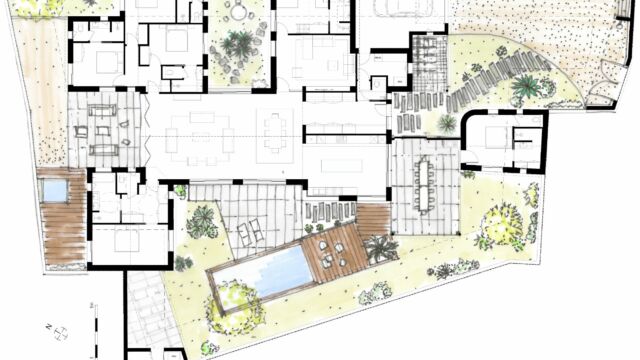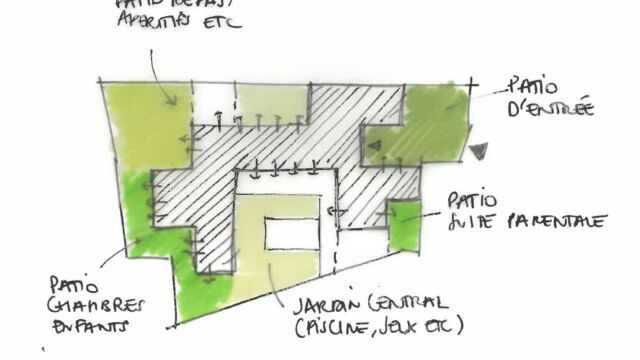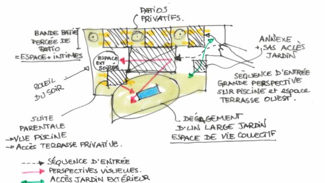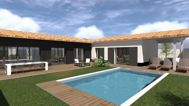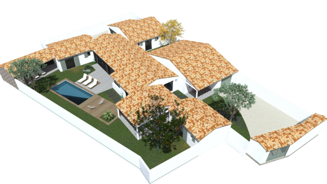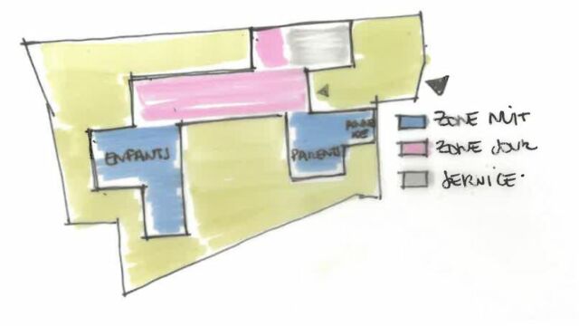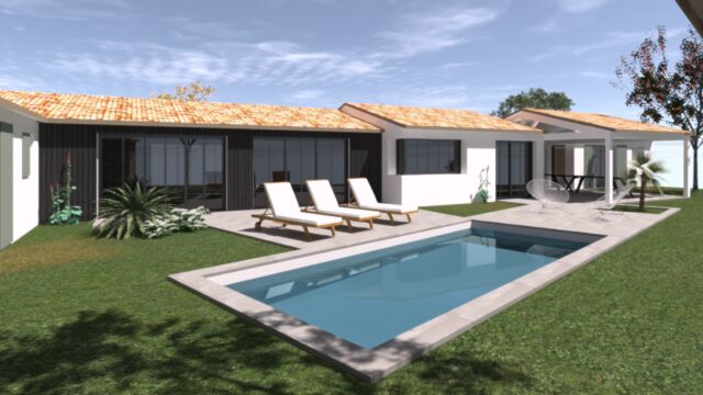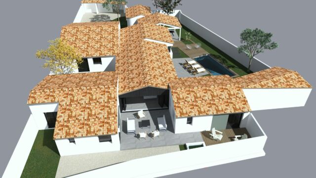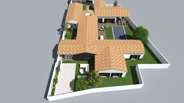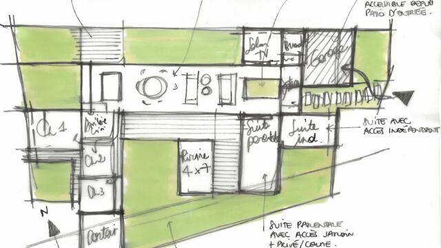 PROGRAMME : Garage, auvent, préau de repas, entrée, buanderie, salon TV, dortoir, salon-salle à manger, 3 suites enfants, une suite parentale accessible aux personnes à mobilité réduite, une suite amis, un préau de détente, une piscine.