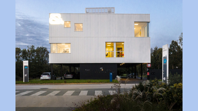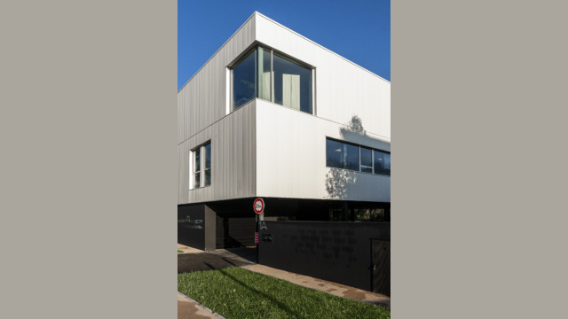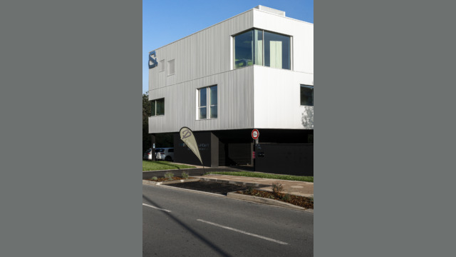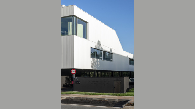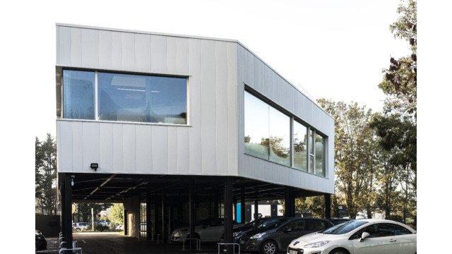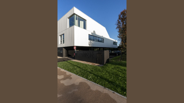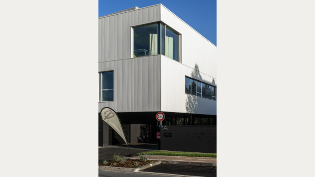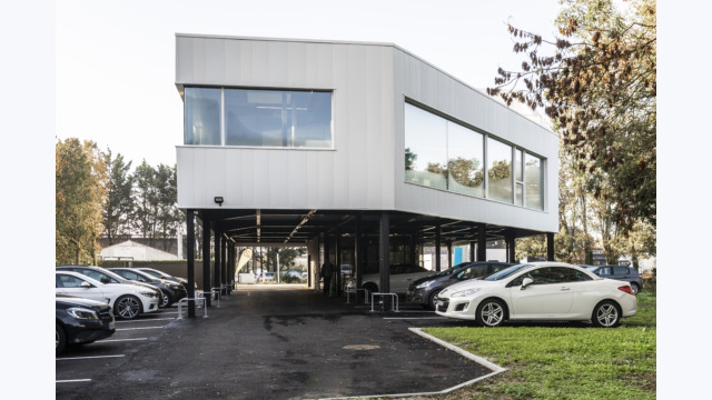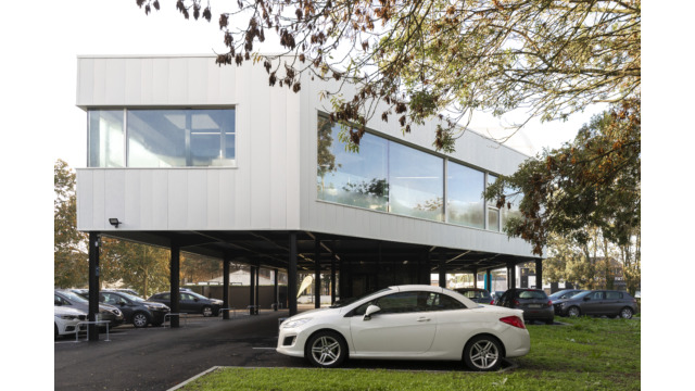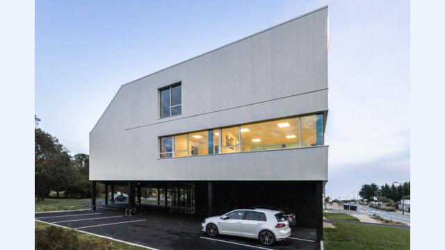 Le projet dans sa silhouette émane directement de l’équation entre les enjeux réglementaires et les besoins de l’entreprise. Massif et imposant, le volume des bureaux s’érige sur une trame de poteaux pour abriter le parking. Volontairement désaxé par rapport à l’alignement bâti existant, ce projet engage une nouvelle dynamique d’implantation à l’entrée du rond-point de Lagord pour former un signal.