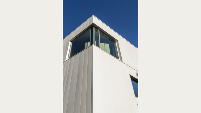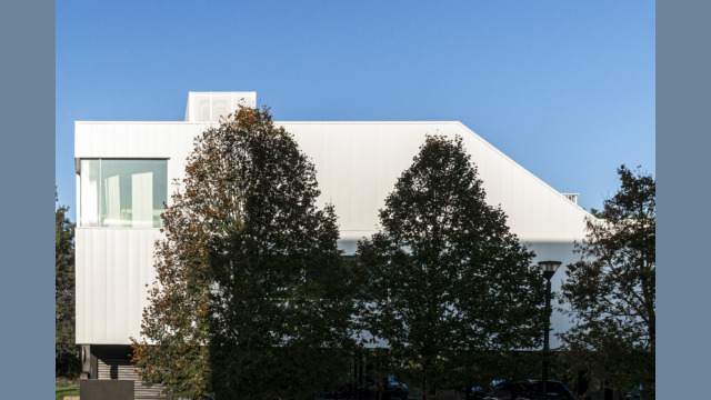 L’identité du bâtiment réside dans sa peau. Par conséquent, pour équilibrer son aspect massif, la vêture du bâtiment est quant à elle, traitée avec finesse. Constituée d’une peau en métal blanc irisé, elle est perforée pour offrir une matérialité sophistiquée et élégante.
