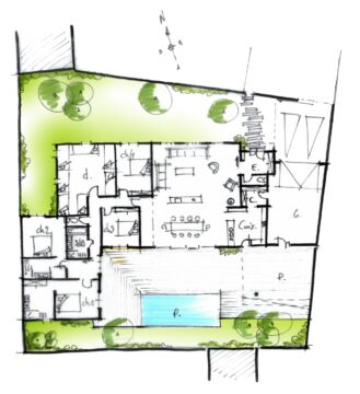 PROGRAMME : Porche d’entrée, Garage, séchoir, entrée, cellier, WC, cuisine, salle à manger, salon, dégagement, dortoir/salon TV, une suite parentale avec dressing et salle d’eau, 2 suites avec salles d’eau privatives, une chambre simple avec salle de bain commune, pool-house, piscine.