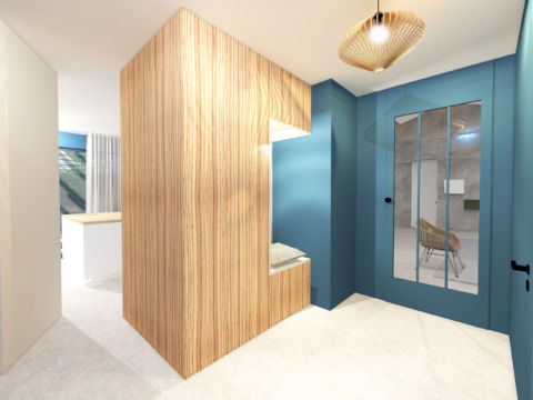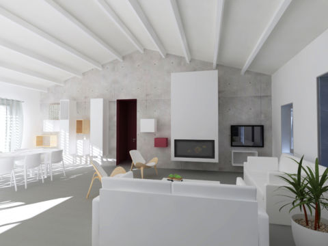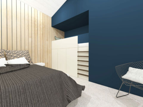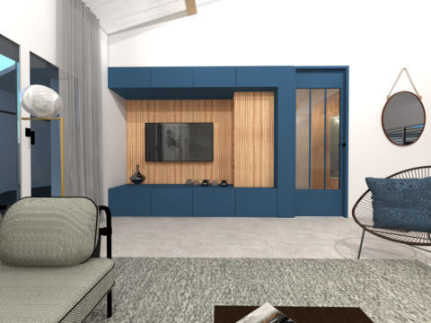DESCRIPTION DU PROJET LA FLOTTE 5 : La maison s’implante sur une parcelle dite « en drapeau ». Plusieurs espaces extérieurs entourent la maison tantôt ouverts sur les pièces de vie, tantôt partagés entre les chambres, tantôt privatisés à un seul espace. Un large porche d’entrée permet l’accès à la maison. Une pièce de vie généreuse s’ouvre largement sur la piscine, elle bénéficie d’une double orientation. Un travail tout particulier est réalisé sur les murs bétons bruts pour qu’on y distingue les nervures du bois qui a servi à son coulage. L’ambiance contraste donc entre des matériaux bruts comme le béton et des matériaux plus finis comme les habillages en bois des aménagements, des teintes de peintures mates et profondes.