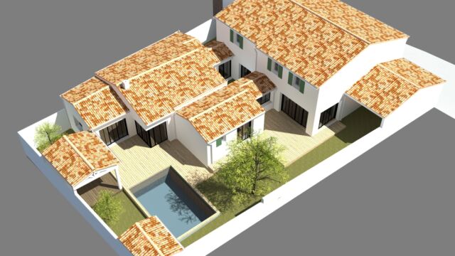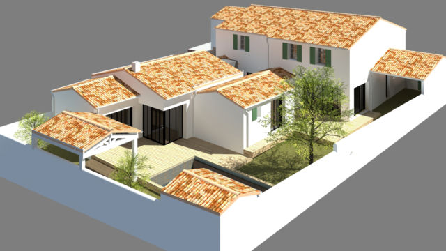 DESCRIPTION DU PROJET LA FLOTTE 8 : Cette maison s’implante sur une parcelle où l’ensoleillement principal provient de la rue. Afin de faire largement bénéficier l’ensemble des espaces d’un ensoleillement optimal, la maison se déroule jusqu’au fond de la parcelle avec des patios pour s’ouvrir sur le soleil matinal et de soirée. Sur la rue, la façade s’inspire du style rétais tandis que sur le jardin de larges baies type atelier permettent des vues sur la piscine et les différentes terrasses.