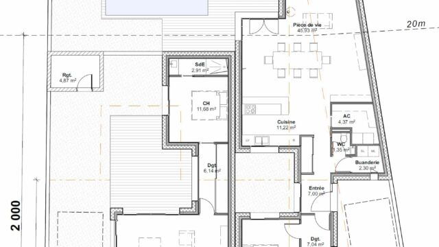 PROGRAMME : Porche d’entrée, Entrée, séjour, cuisine, buanderie, 2 WC, pool-house, piscine, une suite parentale avec salle de bain, une suite avec salle d’eau, 2 chambres enfants dont une avec couchage mezzanine, une salle d’eau commune.