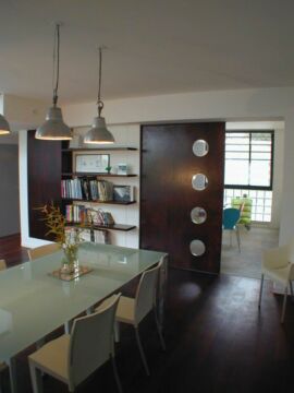 De plus, des matériaux rappelant l’histoire du lieu : béton poncé au sol, tôle ondulée galvanisée…contrastent avec un parquet en bois exotique; et la blancheur des murs met la lumière en valeur. Après cela une majeure partie du mobilier est dessinée par l’architecte par souci d’harmonie et d’homogénéité.
