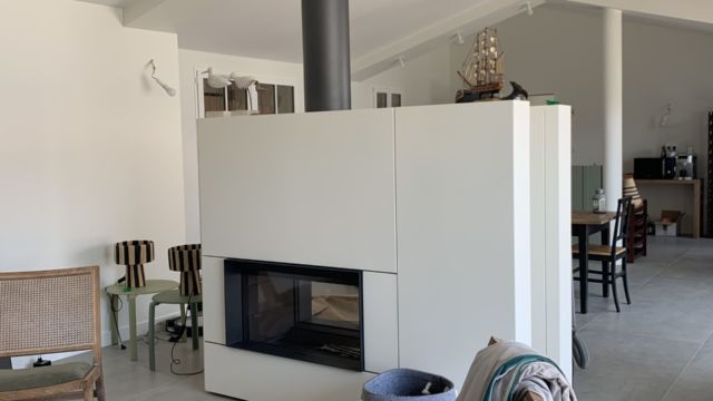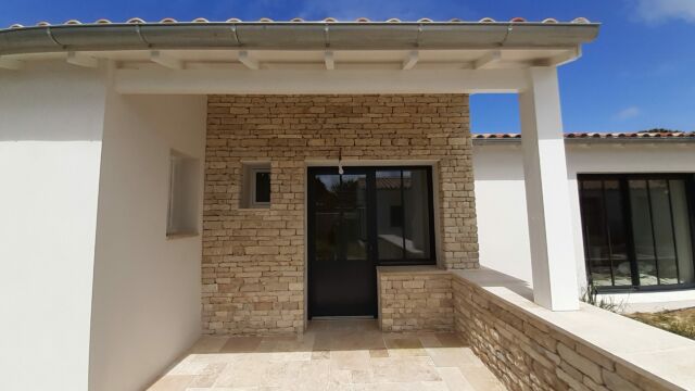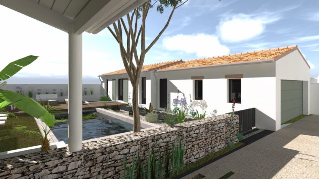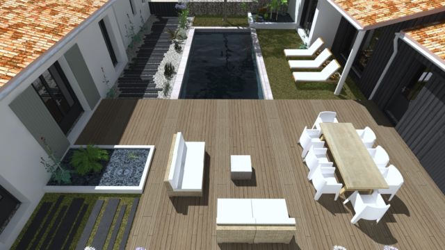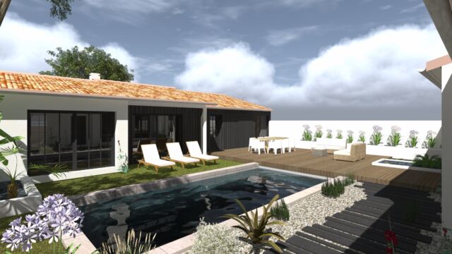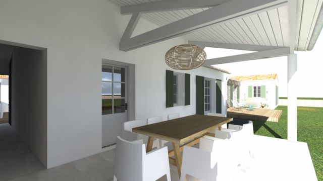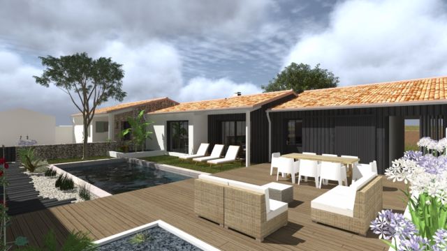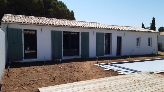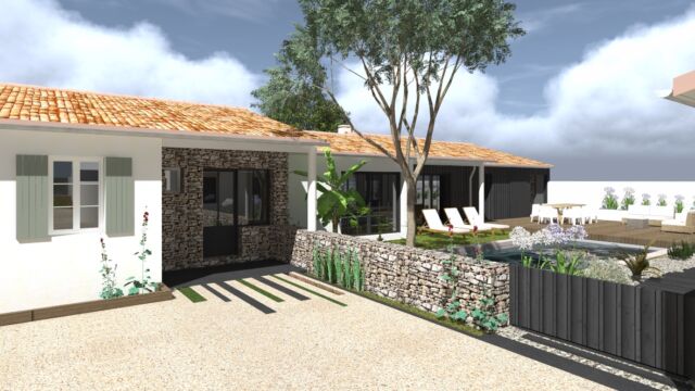 DESCRIPTION DU PROJET LA LOIX 2 : Cette maison neuve s’implante à la lisière d’un espace dunaire sur la commune de Loix. La moitié de la surface du terrain est inconstructible pour protéger cet espace naturel. Sur la partie constructible, la maison s’implante en deux bandes qui s’implantent de part et d’autre d’un grand patio avec piscine. Cet espace extérieur est ainsi abrité des vents dominants et des vues des parcelles voisines. L’ensemble des espaces de la maison s’ouvre cet espace. Au Nord, on retrouve la maison principale constituée de 3 chambres dont une suite parentale. Au Sud, une annexe habitable permet d’accueillir des invités et cet espace accueille un espace TV.