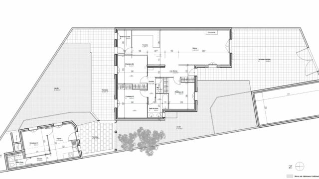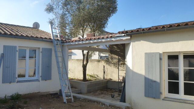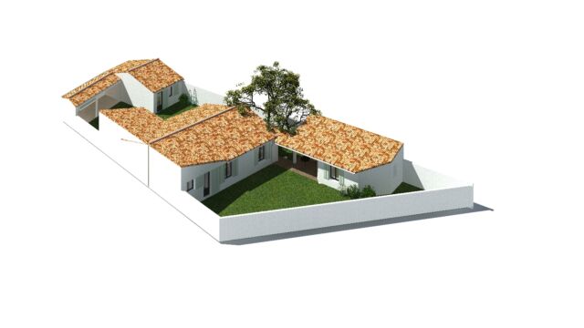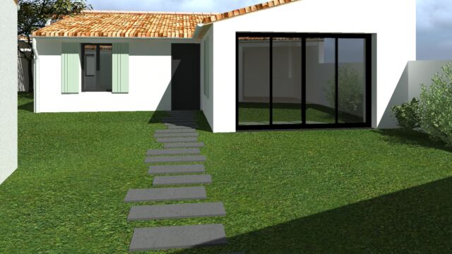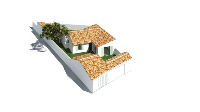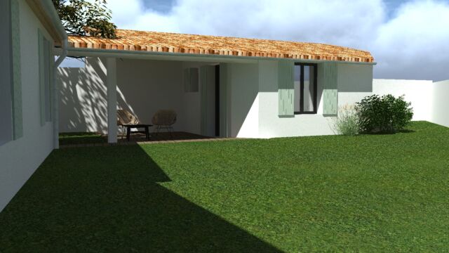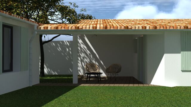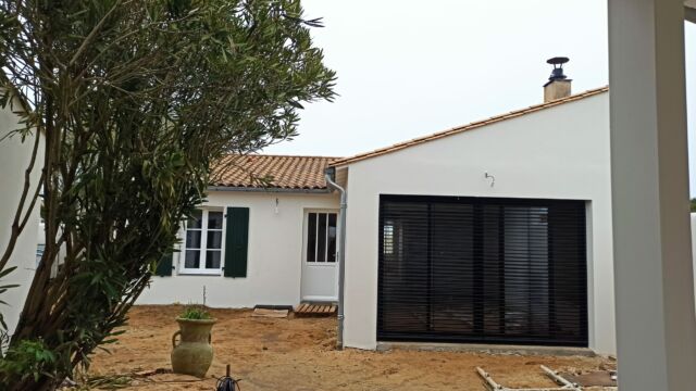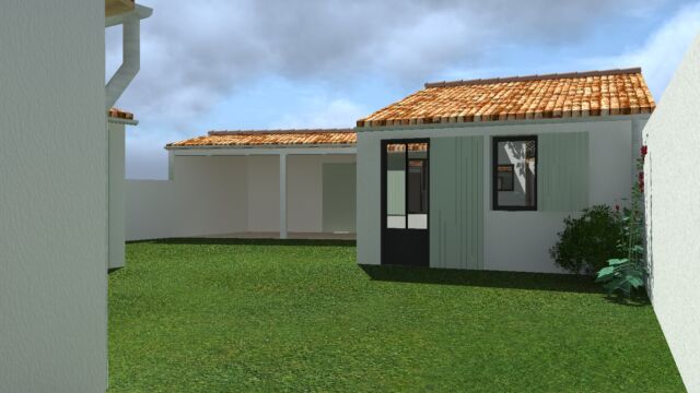 Une maison individuelle et ses annexes sont réhabilitées pour répondre aux enjeux réglementaires et retrouver une esthétique rétaise tout en adaptant les espaces aux usages des nouveaux propriétaires. Les ouvertures sont donc modifiées et l’organisation intérieure adaptée aux nouveaux besoins. La construction d’un préau permet la liaison de la maison principale à l’annexe dédiée aux invités ainsi que la création d’une petite terrasse extérieure couverte. Au sud, c’est la construction d’un préau d’entrée qui génère une façade sur rue et permet de donner un peu d’intimité au jardin de la maison.