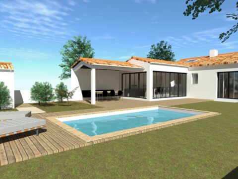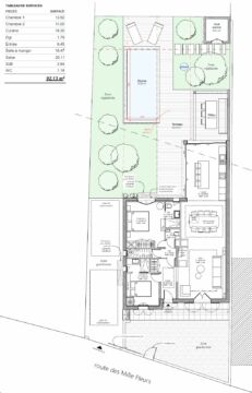 PROGRAMME : Entrée, 2 chambres avec salle de bain, WC, séjour, salle à manger et cuisine. Un abri de jardin, un préau et une piscine.